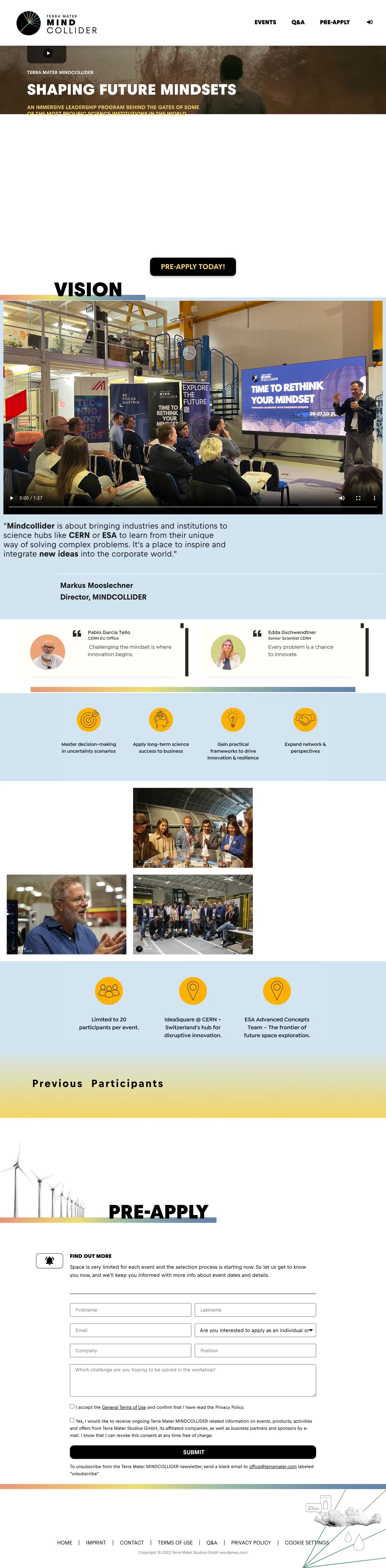 Mindcollider is an executive leadership programme run by Terra Mater, offering immersive experiences at world-renowned science institutions including CERN and ESA. The brief was to build a site that matched the prestige of the programme — communicating its unique positioning clearly to senior decision-makers, driving pre-applications, and handling enquiries from prospective participant organisations.