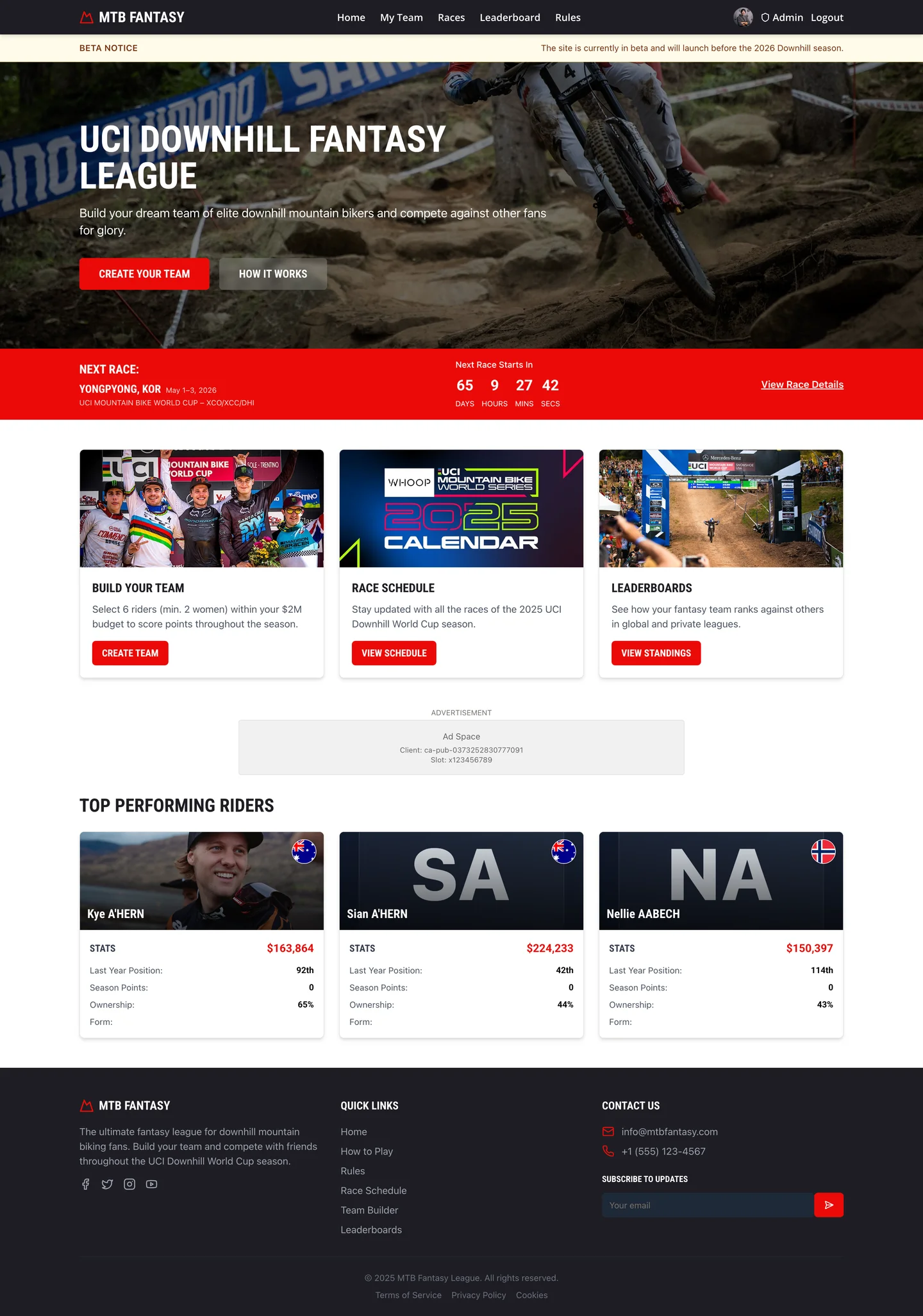 I'm a downhill mountain bike fan and I wanted a fantasy league that matched how I thought the game should work. The existing fantasy MTB options out there had mechanics I found frustrating — awkward team-building rules, unclear scoring, or clunky interfaces that made the whole experience feel like an afterthought. So I decided to build my own from scratch, with the game mechanics and UX I actually wanted as a player.